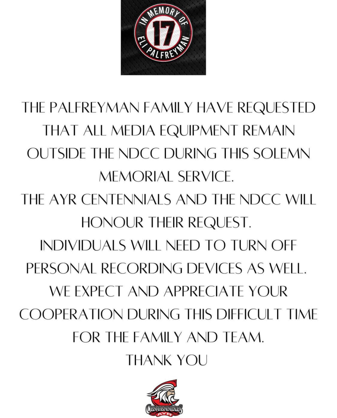 The Palfreyman family have requested that all media equipment remain outside the NDCC during this solemn memorial service. The Ayr Centennials and the NDCC will honour their request. Individuals will need to turn off personal recording devices as well. We expect and appreciate your cooperation during this difficult time for the family and the team.